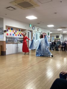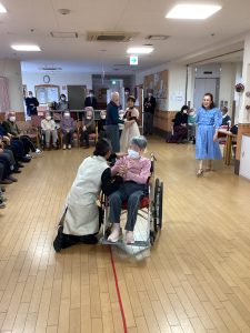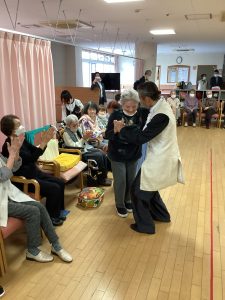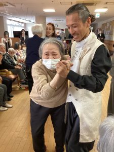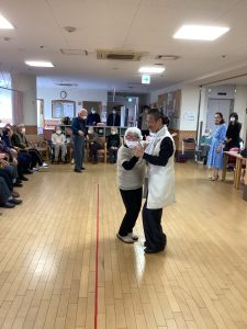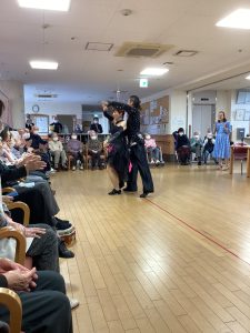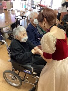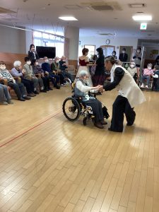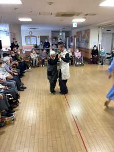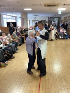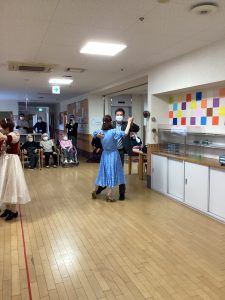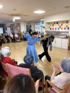 ほほえみの里のケアマネージャーが普段から通われている社交ダンス教室の先生でもある工藤先生が今回で2度目の訪問をして下さいました。ご利用者の皆様をお姫様にする!笑顔になってもらう!をモットーに普段から保育園や介護施設などで社会福祉活動もされているそす。タンゴ・ワルツ・ルンバなど披露してくださいました。後半には、工藤先生が全ご利用者様と踊って下さり、予告通り、全ご利用者&職員を笑顔にして下さいました。普段は歩行器を使って歩かれている方も先生のリードで何も使わず、ゆっくりとステップを踏んでいた事には職員もびっくりしました。車いすの方も座ったままで手を引かれ、まるで一緒に踊っているようでした。皆さん工藤先生のマジックにかかりお姫様そのものでした。