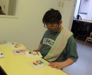 『カードのクイズに挑戦』では認知・理解を目的に出されたカードの反対ことばを答えたり、文カードは使う順に並び変えるもので、生活カードではヒントを聞いてどのカードかを当てるというものでした。簡単なカードから始まりだんだん難しくなってくると「え?何やったかいな」と思いつくことばを挙げていき、それでも分からない時はヒントももらい正解していきました。クイズに答えるばかりではなく、逆に職員にクイズを出したりと、やり取りも楽しみながら取り組みました。