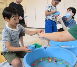 人気の金魚すくいでは、じっくり時間をかけて2つのポイでいくつとれるか⁉挑戦!ホワイトボードの友だちの記録も意識しつつ「どれを取るか」もワクワク。たくさんすくって持ち帰れる3つを選ぶのも悩ましくも楽しい時間です。冷たい水に触れているのが気持ちよくって長くのんびりしていた児童もありました。