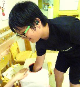 そして、毎年夏祭りでやりたいことを聞くと出てくる意見『お菓子のつかみどり‼』全部のコーナーを周り、カードにチェックが入ったら、いざ!つかみ取りへ!箱に手を入れゴソゴソ…「グミ探すわ」「これうまい棒や」などワクワクドキドキ♬普段のおやつの時間には見かけない駄菓子もあり、頬張るみんなの顔もスペシャル感がでていましたよ。