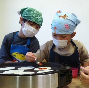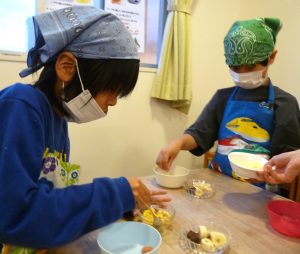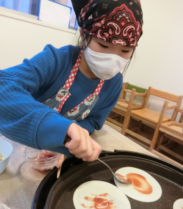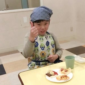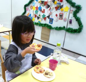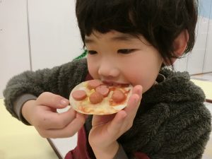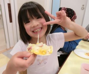 ウィンナーとコーンのピザと、バナナチョコのスイーツピザも作ったよ!