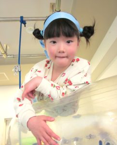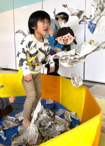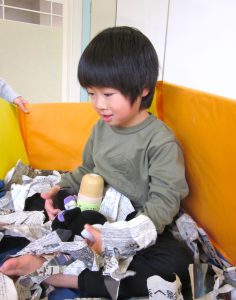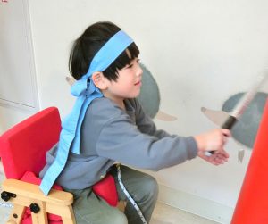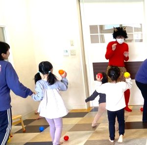 鬼が登場すると「オニは そと」「ふくは うち」とボールを投げ、オニをやっつけることを楽しみました。