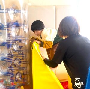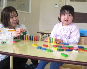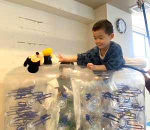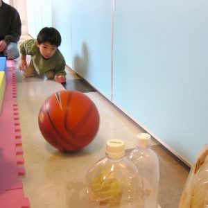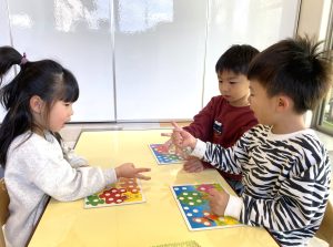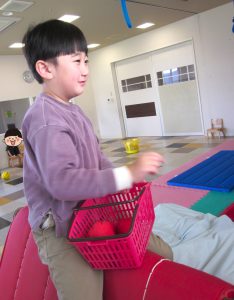 運動遊びでクリアするとボールの豆をもらい、カゴいっぱいたくさんの豆を集めました。