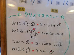 高菜とゆかりのおにぎり、からあげ、エビフライ、オムレツ、肉団子、コールスローサラダ、コーンポタージュ、フルーツがふるまわれました!