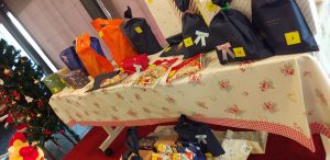 前方のステージには、箱の大きな目玉景品から小さな箱の景品、きれいな袋の包まれた景品などさまざまな景品が並べられています。