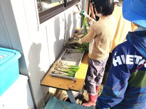 収穫した野菜が綺麗になるようにと丁寧に作業に取り組まれました。生徒の皆様に袋詰めしていただいた、野菜は翌日の販売会で販売をさせていただきました。ありがとうございました。