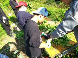 収穫した野菜が綺麗になるようにと丁寧に作業に取り組まれました。生徒の皆様に袋詰めしていただいた、野菜は翌日の販売会で販売をさせていただきました。ありがとうございました。